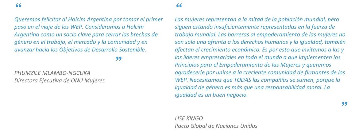 Holcim Argentina ha adoptado los Principios para el Empoderamiento de las Mujeres (WEP´s) de las Naciones Unidas como parte de su compromiso para promover la igualdad de género y el empoderamiento de las mujeres en el trabajo, el mercado y la comunidad.