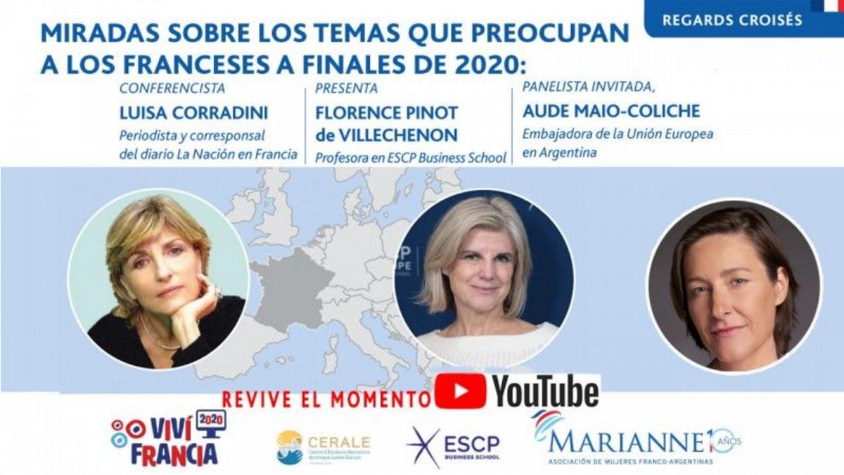 Conferencia Regards Croisés sobre temas que preocupan a los franceses, a finales de 2020. Presentada por la Vicepresidenta de la asociación, Marie Sinizergues. Consistió en un diálogo entre tres socias Marianne, especialistas en temas de Europa. Miradas cruzadas sobre la Unión Europea, sus estrategias industriales, sanitarias y geopolíticas. También se incluyó el tema de las pymes. Las participantes fueron Aude Maio-Coliche, Embajadora de la Unión Europea en Argentina; Luisa Corradini, periodista y corresponsal del diario La Nación en Francia, y Florence Pinot de Villechenon,